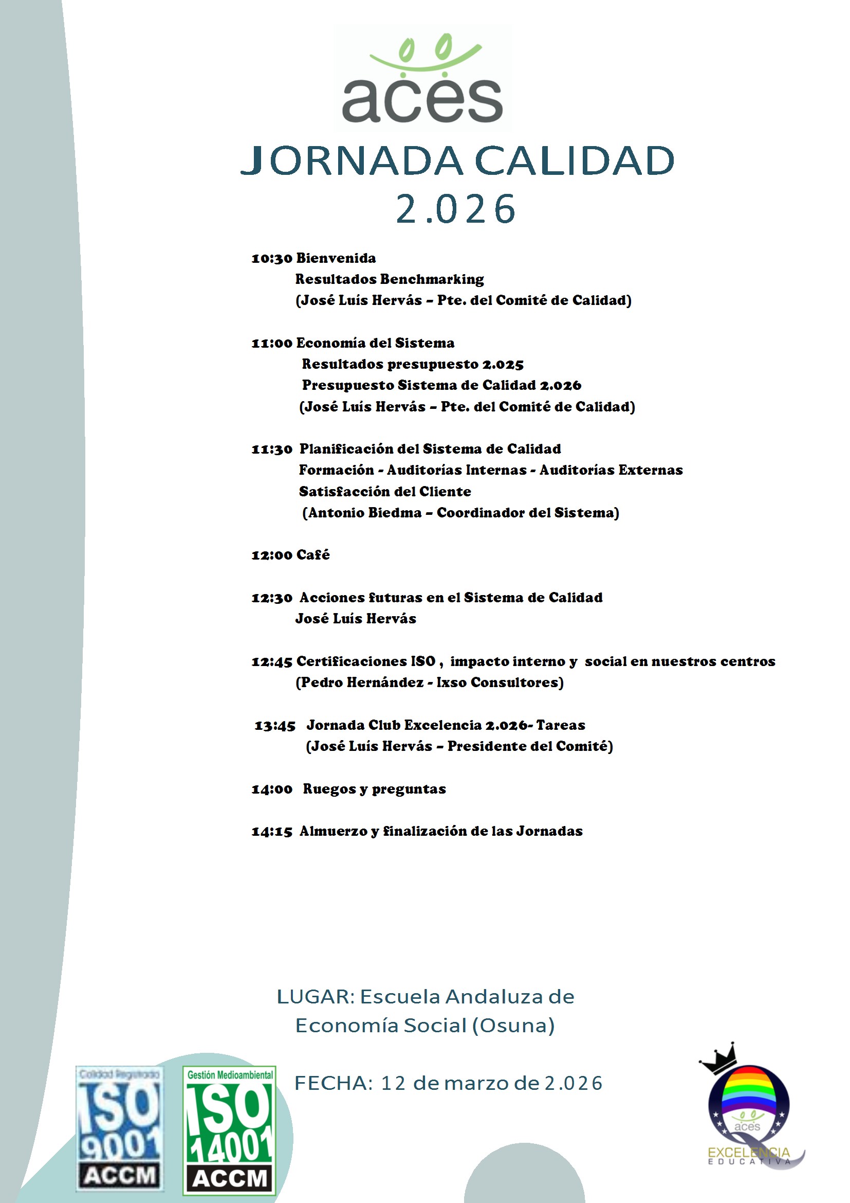El próximo día 12 de marzo, se reúnen los centros del Sistema de Calidad ACES en su reunión anual. Entre otros se dará cuenta del presupuesto anterior y de sus resultados, así como del presupuesto para el año actual.